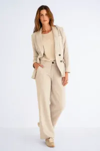 Lange sandkleurige blazer met elegante blauwe strepen en een kraag. De blazer is voorzien van knopen aan de voorkant, praktische klepzakken en een sierlijk borstzakje voor een verfijnde uitstraling. Perfect om elke outfit een stijlvolle touch te geven.