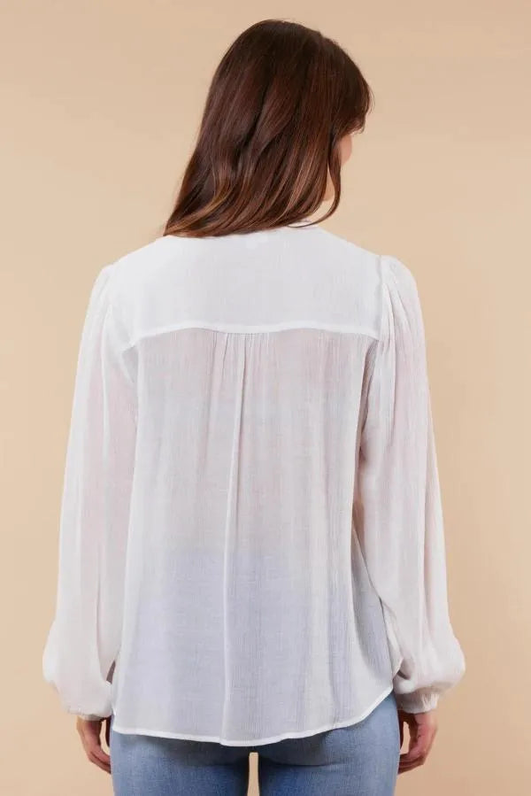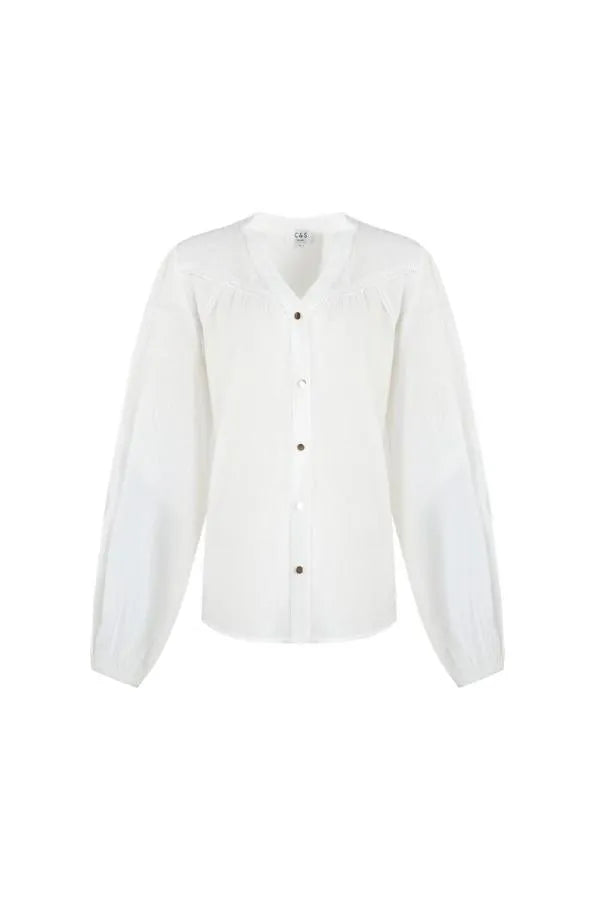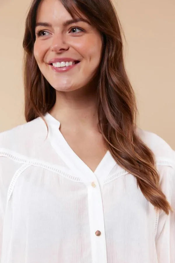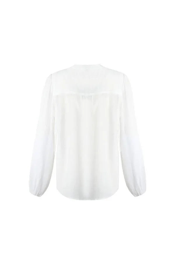 De Ann top is gemaakt van crêpestof en heeft een recht model met een opengewerkt motief op de borst en een knoopsluiting.