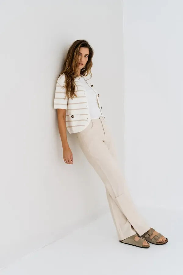 De Nilla is een kort vest gemaakt van zachte katoenkwaliteit, voorzien van een stijlvol streeppatroon. Dit vest is beschikbaar in een uni of off-white kleur en is ideaal voor een casual look.